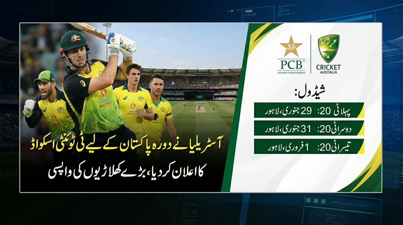 آسٹریلیا نے دورہ پاکستان کے لیے ٹی ٹوئنٹی اسکواڈ کا اعلان کر دیا، بڑے کھلاڑیوں کی واپسی لاہور (ویب ڈیسک): کرکٹ آسٹریلیا نے رواں ماہ پاکستان کے خلاف شروع ہونے والی تین ٹی ٹوئنٹی میچوں کی سیریز کے لیے اپنے مضبوط اسکواڈ کا اعلان کر دیا ہے۔ اس دورے کے لیے کینگروز ٹیم کی قیادت مچل مارش کریں گے جبکہ ٹیم میں کئی بڑے کھلاڑیوں کی واپسی ہوئی ہے۔ آسٹریلیا کی جانب سے جاری کردہ اعلامیے کے مطابق اسکواڈ میں کپتان مچل مارش کے علاوہ ٹریوس ہیڈ، پیٹ کمنز، گلین میکسویل، جوش ہیزل ووڈ، ایڈم زمپا، اور میتھیو شارٹ شامل ہیں۔ دیگر کھلاڑیوں میں جیک فریزر میک گرک، مارکس اسٹوئنس، آرون ہارڈی، ناتھن ایلس، جوش انگلس اور اسپینسر جانسن کو بھی ٹیم کا حصہ بنایا گیا ہے۔ سیریز کا شیڈول: پاکستان اور آسٹریلیا کے درمیان سیریز کے تمام میچز لاہور کے قذافی اسٹیڈیم میں کھیلے جائیں گے۔ شیڈول کے مطابق: پہلا ٹی ٹوئنٹی میچ: 29 جنوری دوسرا ٹی ٹوئنٹی میچ: 31 جنوری تیسرا ٹی ٹوئنٹی میچ: 1 فروری تمام میچز پاکستانی وقت کے مطابق شام 6 بجے شروع ہوں گے۔ آسٹریلوی ٹیم 28 جنوری کو لاہور پہنچے گی جہاں مختصر ٹریننگ سیشن کے بعد سیریز کا آغاز ہوگا۔ یہ سیریز دونوں ٹیموں کے لیے فروری میں ہونے والے میگا ایونٹ کی تیاریوں کے حوالے سے انتہائی اہمیت کی حامل ہے۔